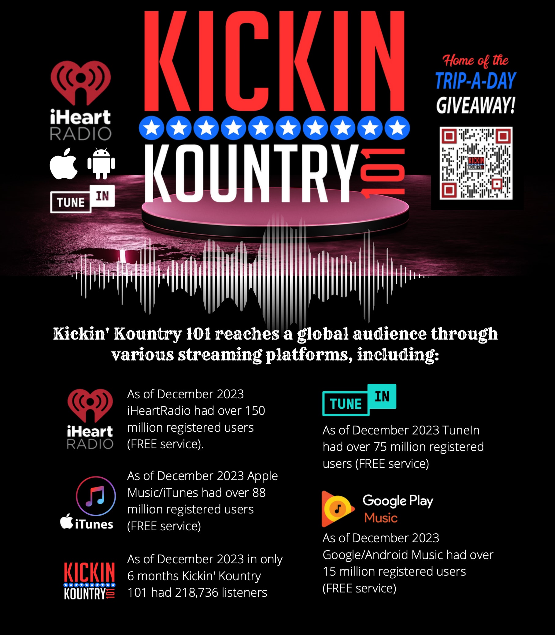 Kickin' Kountry 101 distributed on iHeartRadio, Your New Country Leader, 3X Feature in Country Aircheck Magazine in Nashville (Country Radio's #1 Publication), Attended Jason Aldeans Private Birthday Party, Over 650,000 Listeners in our short time on the air.