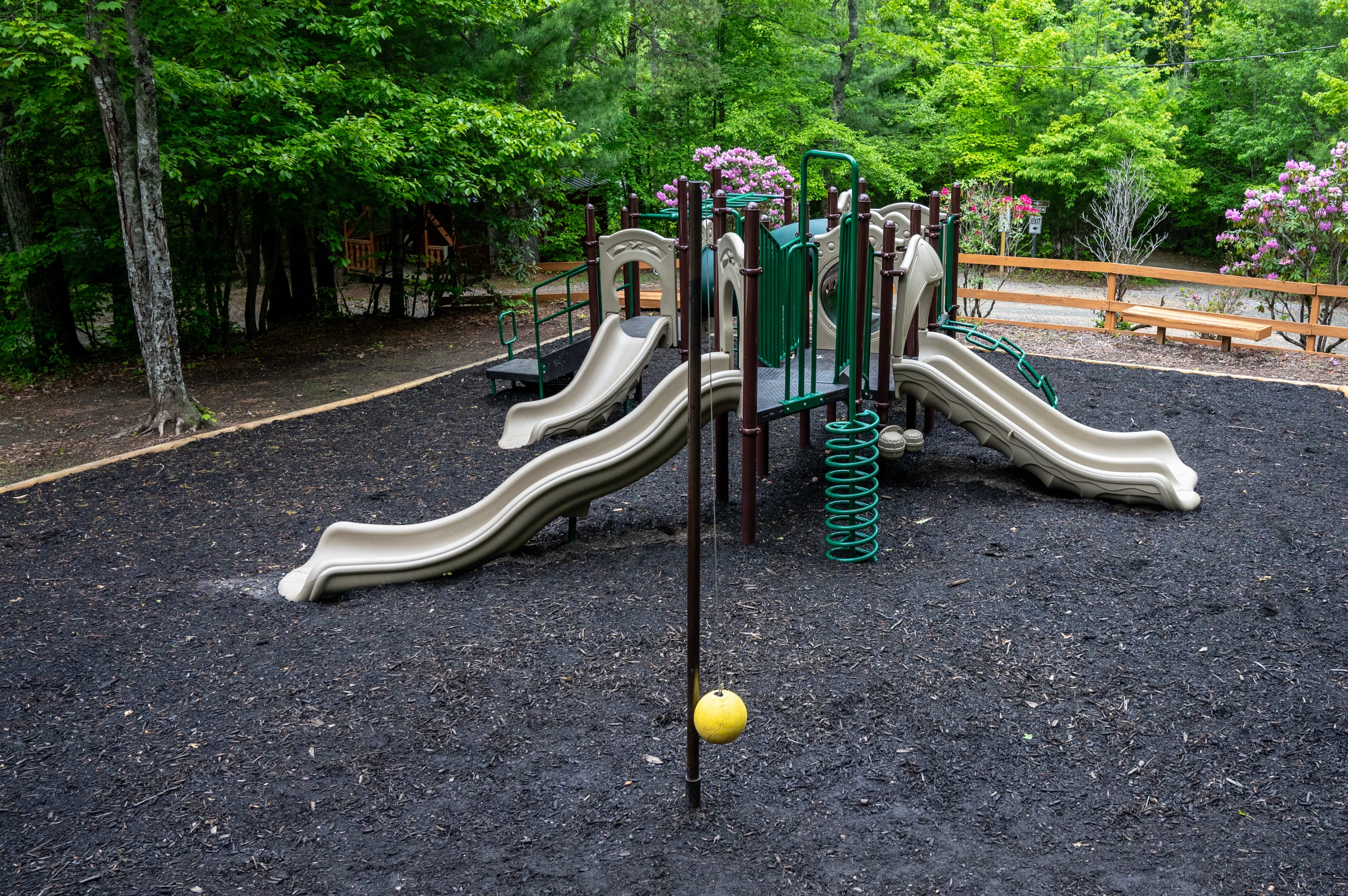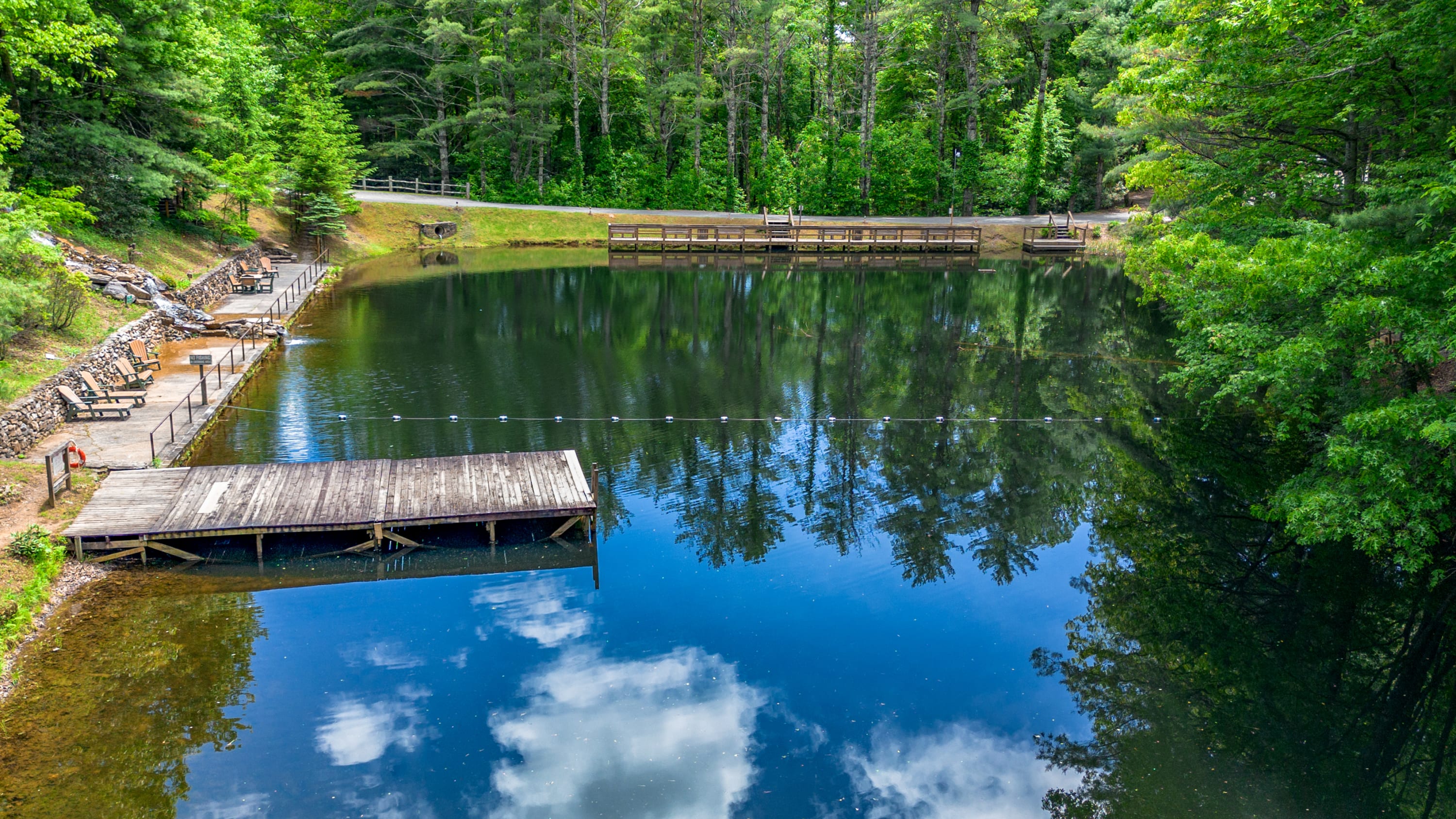 Amenities Swimming lake o private lake stocked with Trout, Bass, & Catfish, Rec Hall with arcade, hiking trails, waterfall, camp store, golf cart rentals, playground, basketball, gem mining, corn hole, ping pong, jumping pillow, laundry facilities, bathhouses, propane ice, and firewood sales, themed weekends, pet friendly sites and lodging.